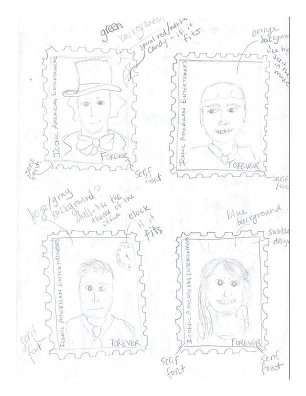 I sketched out each stamp with notes about typography, color palette, and other design choices.